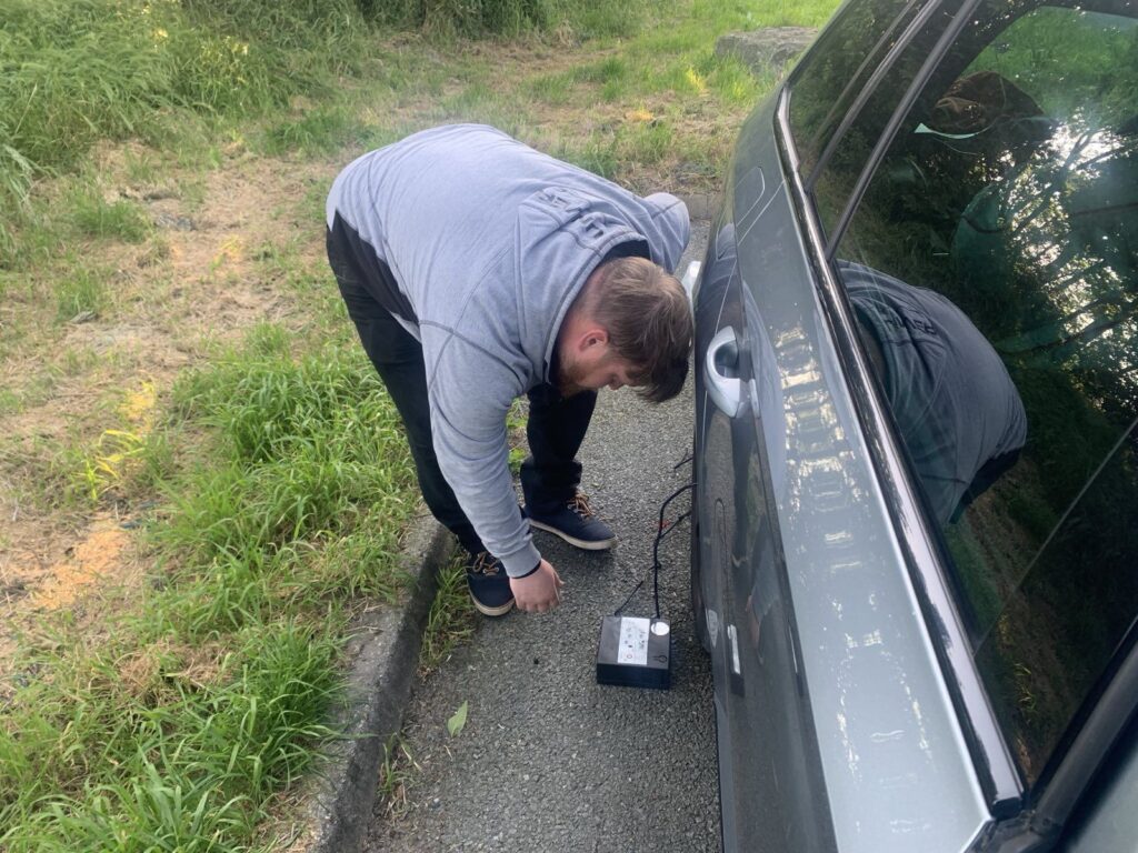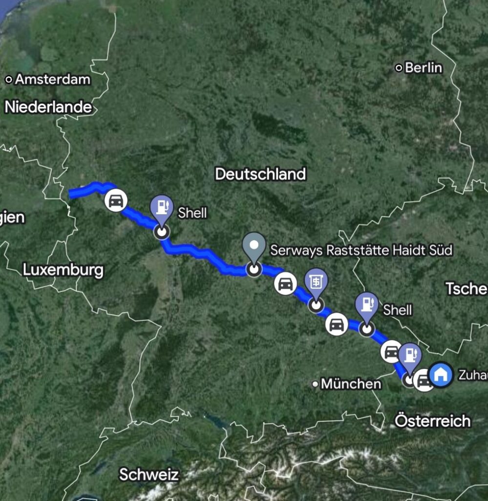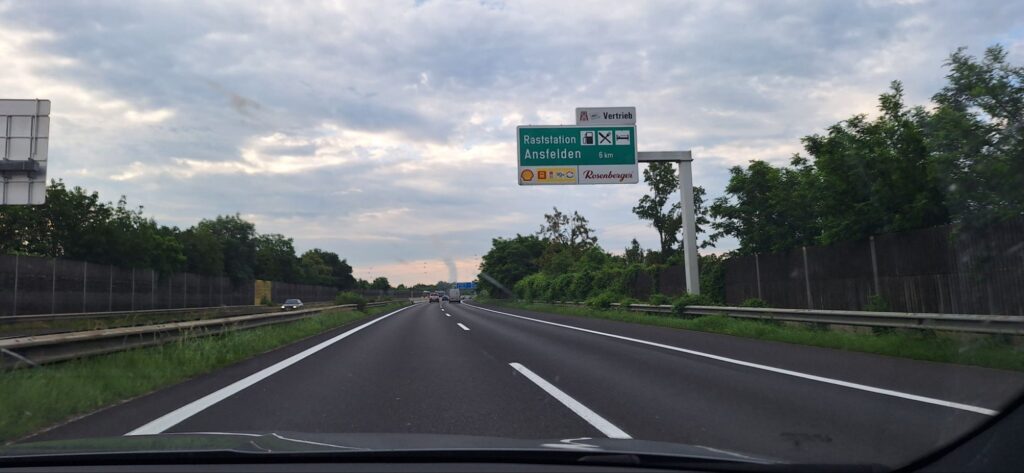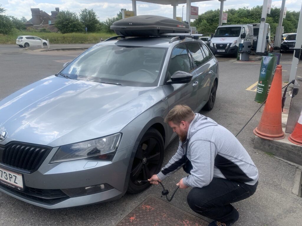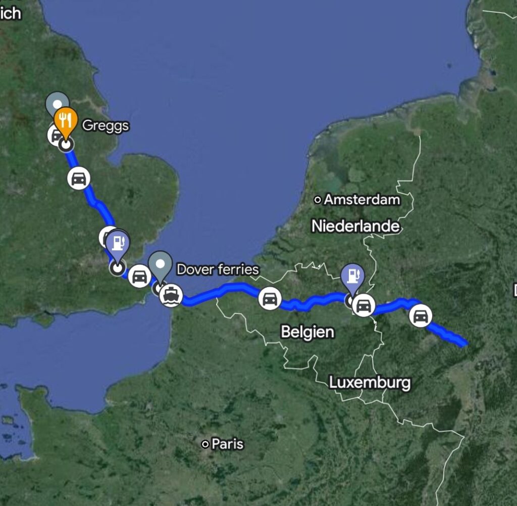 Um 09:45 Uhr starteten wir die letzten englischen Meilen. Um 16:00 Uhr legte die Fähre, mit uns an Board, nach Calais ab. Gegen 19:00 Uhr traten wir auf der französischen Autobahn wieder ins Gaspedal, suchten uns jedoch sofort einen Parkplatz, auf dem wir mit dem mitgelieferten Skoda Kompressor wieder Luft ins rechte Hinterrad pumpten.