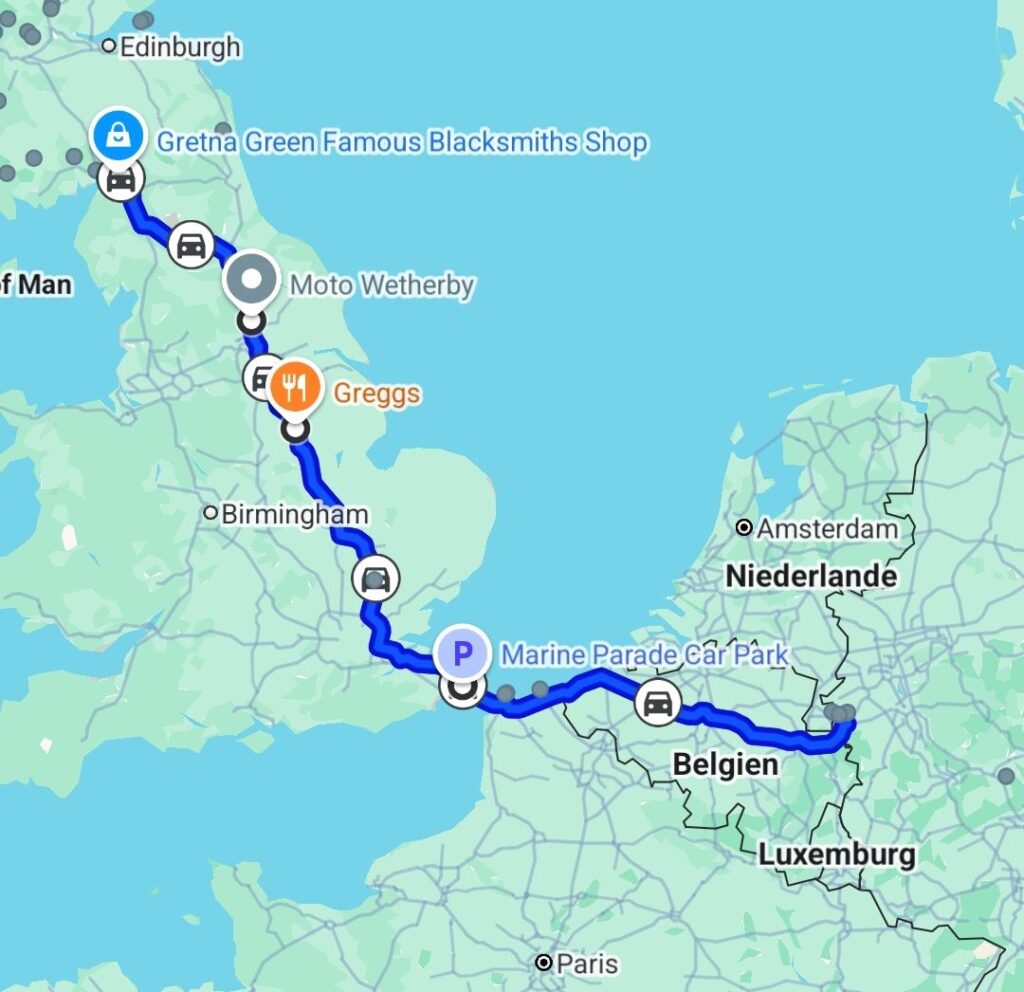 Angekommen am Hafen in Calais am Freitag um 01:15 folgten wir der Schlange von Autos auf die Hauptstraße. Das Umdenken von Links- auf Rechtsverkehr erforderte nochmal volle Konzentration aber wie immer bravourös von Benji gemeistert.