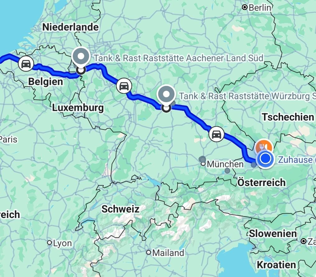 Benji fuhr die ersten drei Stunden bis zur deutschen Grenze während Nathalie vor sich hin döste. Um ca. 04:00 fand der Fahrertausch statt, leider konnte Benji nicht schlafen da ihn die deutsche Autobahn als Beifahrer zu nervös machte. Mit ein paar Bierchen ging’s aber und wir genossen den Sonnenaufgang über Köln und die sonnige Autofahrt.