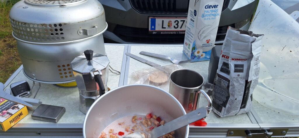 Heute gibt’s nicht viel zu erzählen. Wir schliefen etwas länger. Ich stand um 11:00 Uhr auf und genoss Kaffee und Müsli in der Sonne. Nathalie stapfte um 13:00 Uhr aus dem Auto.